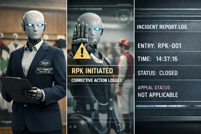 Vee Moodley, CEO of the NHA, introduces the trial deployment of BUTT-ONOMOUS™, an asexual, fully autonomous compliance robot that replaces the human Clerk of Scales in the Jockeys Room at HWB Kenilworth. Programmed with zero ambiguity and zero tolerance, they require no sensitivity training, no workshops, and no legal counsel. Should any individual place an unauthorised hand where it does not belong, the BUTT-ONOMOUS™ robot responds instantly with a corrective slap. The Robot Slap, or “RPK”, is logged, time-stamped, and free of bias. Appeals are not entertained, no money is spent flying inquiry board members around the country, lessons are learned immediately and the slap is considered adequate punishment.