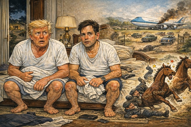 Johann Rupert offers the travelling party accommodation at Drakenstein’s guest quarters. He pops a few bottles of L’Ormarins Cuvee and instructs his staff to throw open the farm gates. During the course of the night, Rupert’s entire vintage car collection is professionally liberated from the Estate’s Motor Museum. Two horse thieves attempt to get their hands on One World and Charles Dickens, but are thankfully kicked into oblivion by the bucking stallions. President Trump and Secretary Of State Rubio, who slept with their doors open, are held up before dawn and relieved of their expensive watches, suits and shoes.