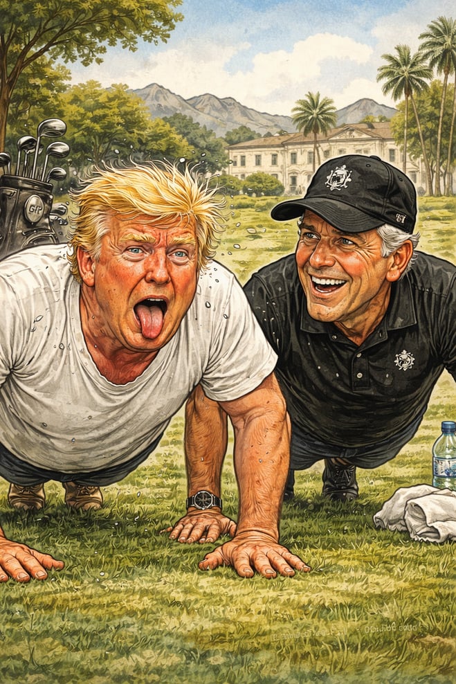Airforce One takes off again, but the crew discovers that nuts, copper wiring and most of the electronic equipment below the flight deck had been dismantled and stolen. The plane performs an emergency landing on a private air strip near George, where Trump and Rubio are whisked away to spend the night at Ernie Els’ property in Herold’s Bay. Ernie stands watch himself and wards off further disaster by knocking three approaching house breakers unconscious with his sand wedge.
