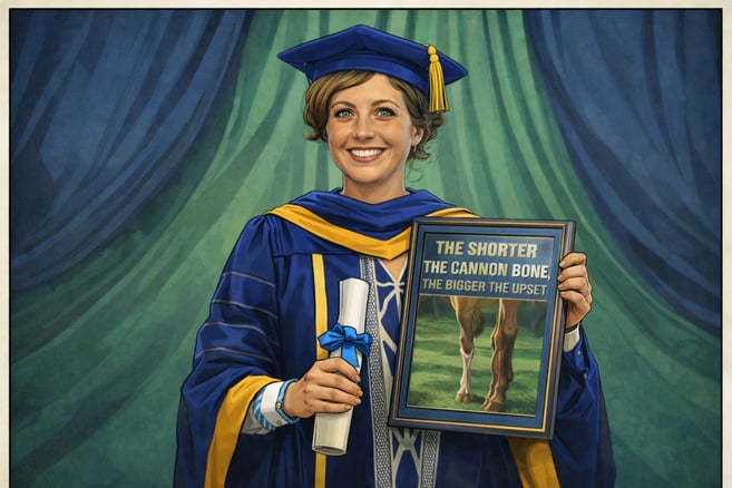 Vicky Minott completes a Master’s Degree in Equine Studies and is awarded an Honorary Doctorate for her groundbreaking Dissertation, “The Shorter The Cannon Bone, The Bigger The Upset”.