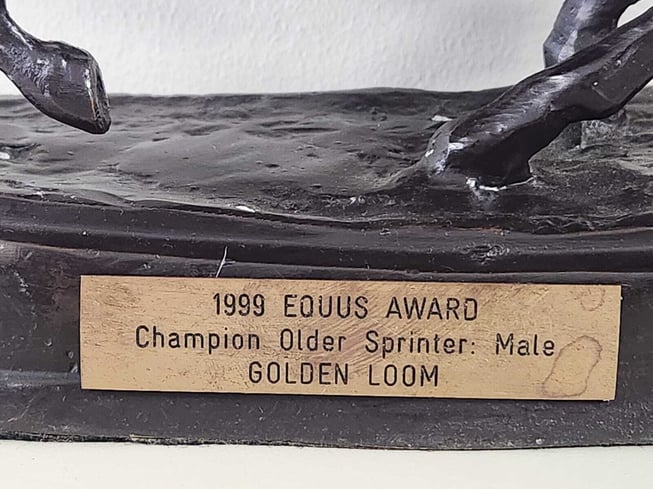 The big bay gelding, affectionately known as ‘Goofy,’ raced from March 1996 until November 2003 when he was 10 years old. His remarkable track career spanned seven and a half years. Trained by the legendary Kevin “Buddy” Maroun, Golden Loom raced 78 times, won 22, and was placed on 37 occasions, earning over R2,8 million. His glittering résumé included two Grade 1 Computaform Sprints, the Grade 1 Golden Spur (now the Golden Horse Sprint), and the Grade 3 Senor Santa Sprint, which he captured at the grand age of nine. He won the Equus Champion Sprinter Trophy in 1999 and several Highveld racing awards.