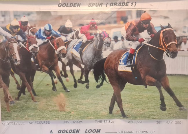 “When we arrived at Scottsville, I still hadn’t said a word about my injury. But one of the other jocks came walking by and said, ‘Hey, Sherman, how’s your finger?’. Buddy’s eyes widened, and Lisa shook her head. I said, ‘Buddy, there is no way you are taking me off Golden Loom, I will ride him. I’m not getting off!’ We strapped the broken finger, I put my gloves on, rode Golden Loom and he helped me all the way through. He knew me so well, he must have sensed something. He gave his all, he was his old, magnificent self and he stormed home by 2.5-lengths at 12-1!”